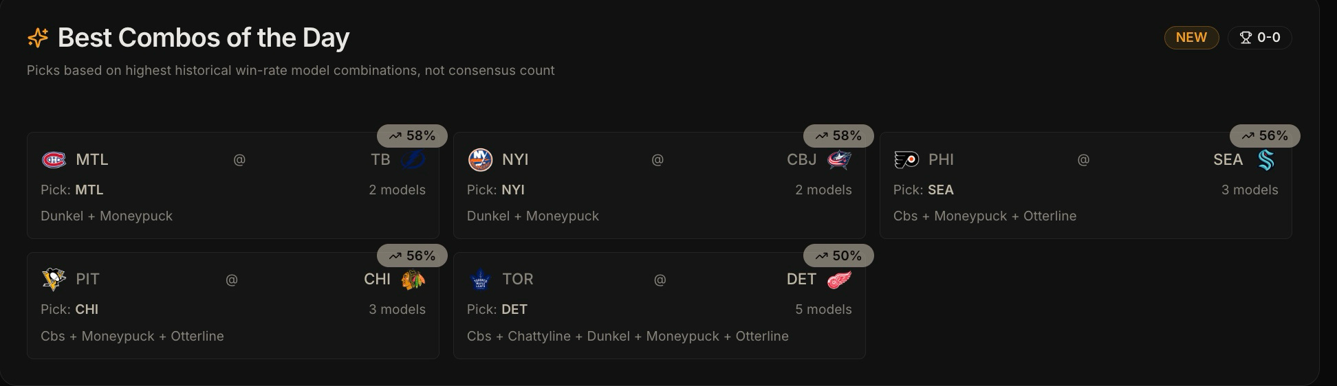 For example, in MTL vs TB, the 2 model combo of Dunkel + MoneyPuck has a higher win rate than the 3 model consensus play. That combo is shown instead. I’ve enabled full tracking so we can directly compare how these combo based picks perform versus traditional consensus over time.